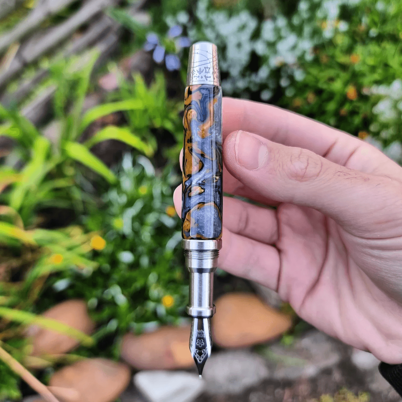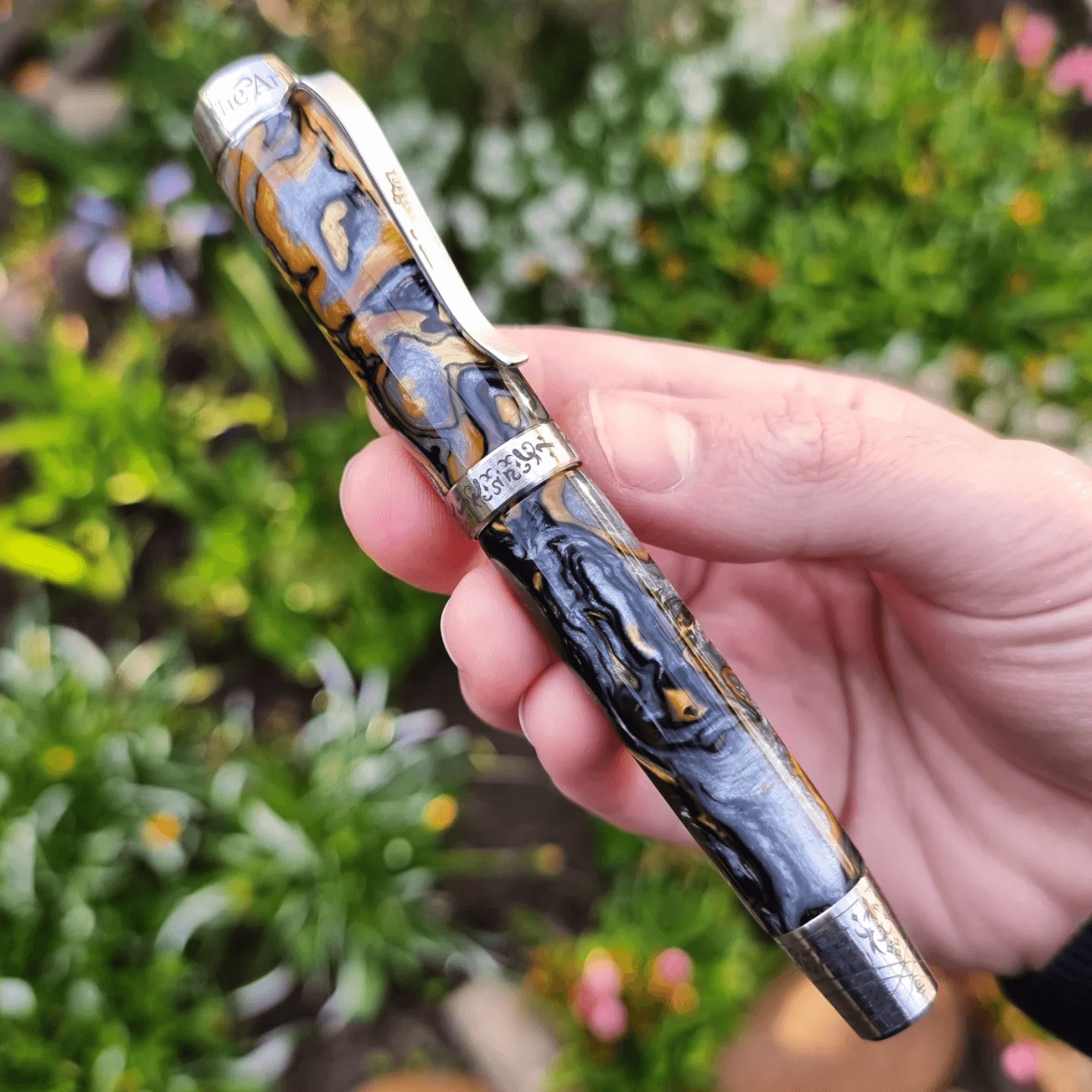 The barrel cap is the lower-most part of the pen. It has the largest surface area for your engraving ideas.