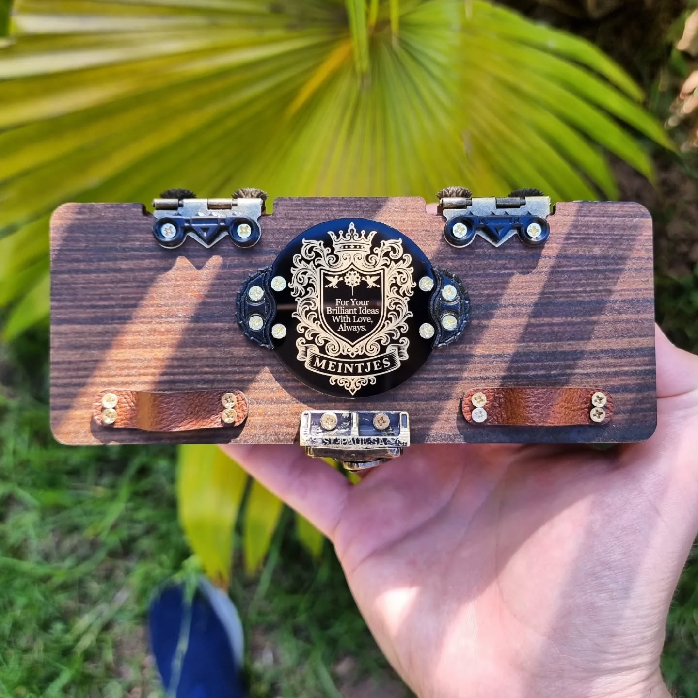 A St. Paul article is focused on presentation. The information you provide will be used to make the presentation unique to the recipient and the article. By default, if you provide a name and surname for engraving, the box will feature a plaque with the family crest of the provided surname. This is custom-designed in the atelier, so there's no need for you to provide anything. The gold pillars of the box are also custom-designed based on the information you provide. If you have a specific message you'd like to include on the case, please add it below. πŸ‘‡